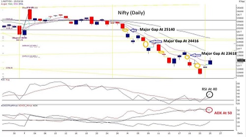 On the daily timeframe, the current move appears to be a follow-through after an exhaustion gap, supported by a panic flush candle formation. With RSI rebounding from oversold levels and ADX gradually declining from elevated levels, this indicates the possibility of a short-term relief rally within the broader downtrend. However, the overall market structure remains weak, continuing to form a clear lower high–lower low pattern, which confirms a sustained downtrend. While daily indicators are stretched and may trigger a temporary bounce from current levels, a meaningful and durable reversal would require either a strong bullish signal on the weekly chart or a decisive gap reclaim above the 23850 level. On the downside, a breakdown below 22800 could lead to fresh unwinding pressure, potentially pushing the index towards the 22500–22260 zone. From a macro perspective, elevated USD/INR levels, firm crude prices above $90 per barrel, persistent FII outflows, and ongoing geopolitical tensions continue to act as key overhangs, limiting upside potential. Given this backdrop, the preferred strategy remains to sell on rise as long as the index trades within the broad range of 23500 to 22500. Traders should avoid aggressive long positions and instead focus on disciplined risk management along with appropriate hedging strategies.