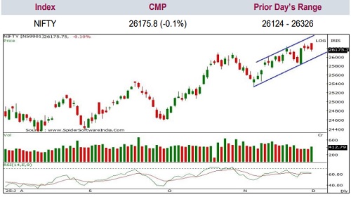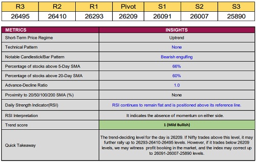 Nifty settled at 26,176, slipping 27 points in the previous session. The index printed a bearish engulfing pattern on the daily chart after confronting a key resistance near its all-time high, signalling profit booking at elevated levels.