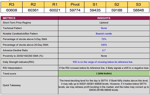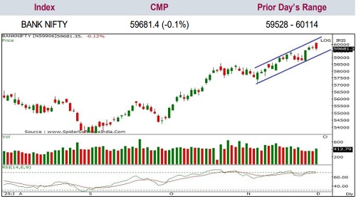 Bank Nifty closed at 59,681, down 71 points, forming a bearish candle with a modest lower shadow, reflecting profit booking at higher levels and mild intraday pressure.