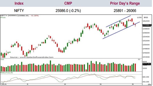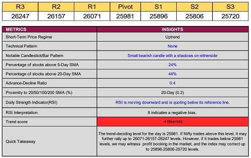 Nifty ended the previous session at 25,986, slipping 46 points. On the daily chart, it printed a small bearish candle with wicks on both sides, reflecting heightened indecision and a lack of directional conviction among participants.