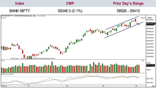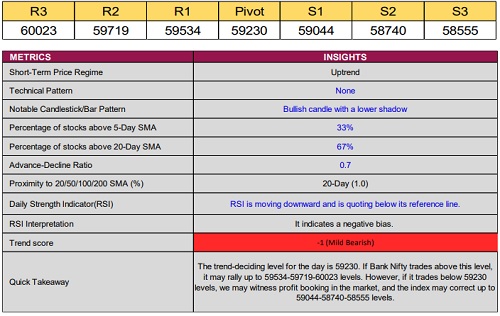 Meanwhile, Bank Nifty gained 74 points and closed at 59,348. The index formed a bullish candle with a pronounced lower shadow, signalling firm buying interest emerging at lower levels and reinforcing underlying support near the 20-day SMA.