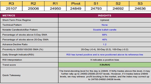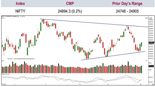 Nifty closed at 24,894 on Friday, gaining 58 points. On the daily chart, it formed a long bullish candle with a higher high–low structure and closed above the previous day’s high, indicating a positive bias.