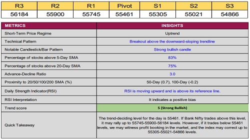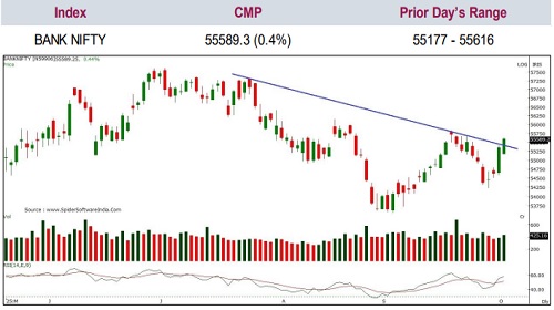 Bank Nifty closed at 55,589, up 241 points. The index formed a bullish candle with a higher high–low formation and broke above the downward-sloping trendline, reinforcing the bullish sentiment.