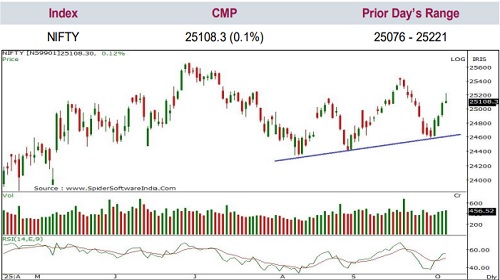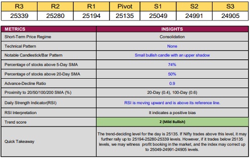 Nifty closed at 25,108, up 31 points. On the daily chart, the index formed a small bullish candle with an upper shadow, signalling selling pressure and resistance at higher levels.