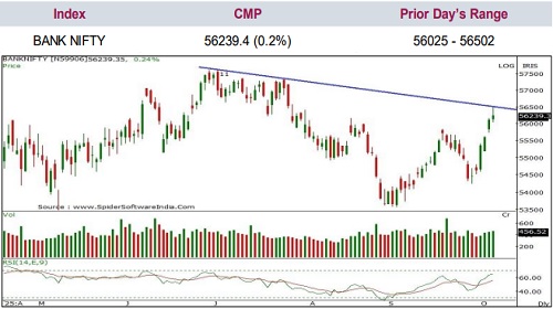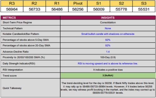 Bank Nifty ended at 56,239, gaining 135 points. The daily chart shows a small bullish candle with wicks on both ends, reflecting heightened volatility and indecision among market participants.