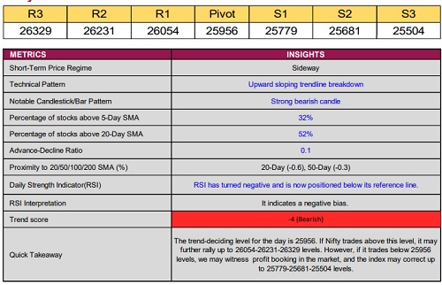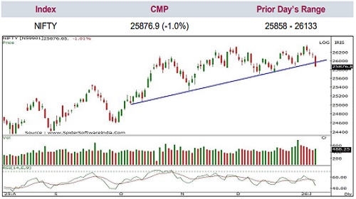 Nifty closed at 25,877, down 264 points, forming a large bearish candle and registering a lower high–lower low structure. The index slipped below the previous session’s low, reflecting growing risk aversion amid U.S. tariff concerns. A decisive break below the rising trendline from 7th November and the 20-day moving average signals a near-term shift in momentum, opening downside potential toward the 25,700 zone.