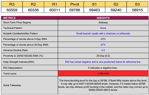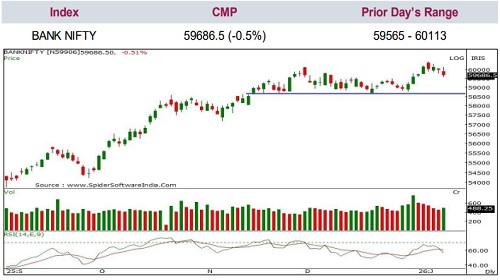 Bank Nifty ended at 59,687, declining 304 points. The index formed a bearish candle with long shadows on both sides on the daily chart, highlighting heightened volatility and supply pressure at elevated levels.