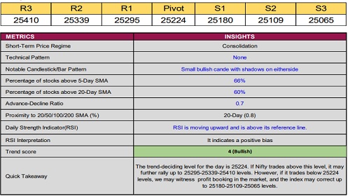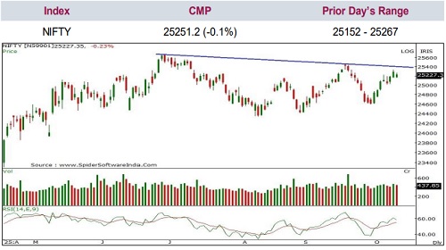 Nifty settled at 25,227, down 58 points, forming a small bullish candle on the daily chart. However, the price action remained confined within the previous session’s high–low range, reflecting a lack of directional conviction.