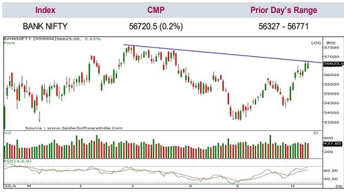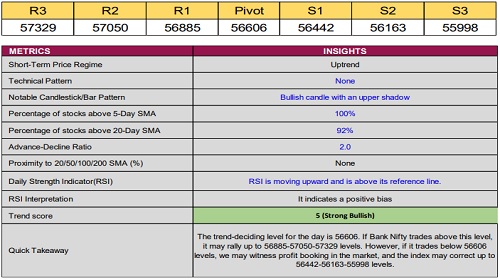 Bank Nifty ended at 56,625, up 15 points. The index formed a bullish candle with an upper shadow, signalling selling pressure and resistance at higher levels.