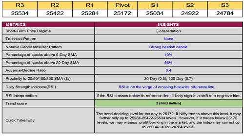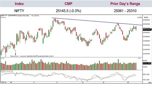 Nifty closed the last session at 25,146, slipping 82 points. The index formed a bearish engulfing candle on the daily chart after testing a key resistance zone, signalling profit booking at higher levels and a potential pause in the uptrend.