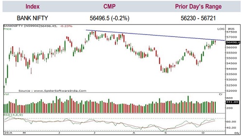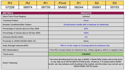 Bank Nifty ended at 56,496, down 129 points, forming a small bearish candle with wicks on both ends, reflecting indecision among market participants over the near-term direction.