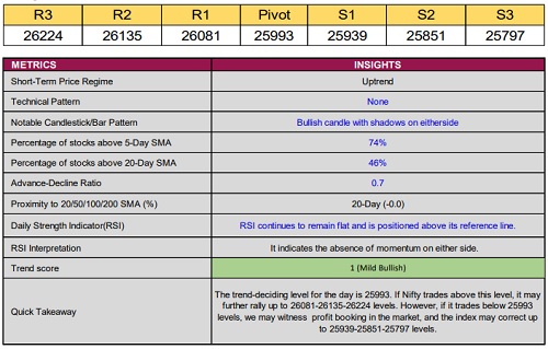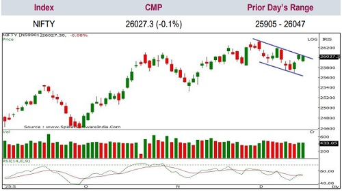 Nifty closed the previous session at 26,027, with a marginal loss of 20 points. On the daily chart, the index formed a bullish candle with shadows on both ends, indicating indecision among market participants regarding near-term direction.