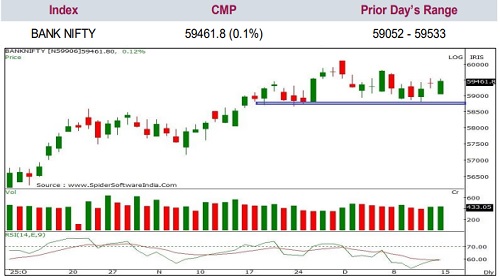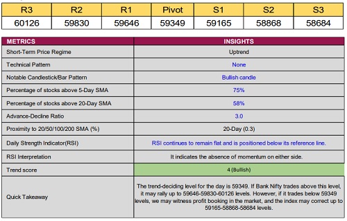 Meanwhile, Bank Nifty settled at 59,462, up 72 points. The index printed a strong bullish candle on the daily chart and decisively closed above its 20-day SMA at 59,293, reinforcing a positive short-term bias.