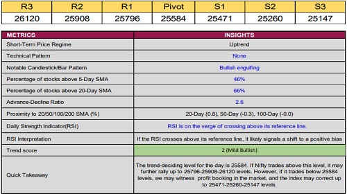 Nifty closed at 25,683, gaining 212 points in the previous session. On the daily chart, the index formed a bullish engulfing candle, signalling a positive bias as buyers stepped in at lower levels and pushed prices just above the 40-day EMA near 25,670. However, the upper band of Friday’s bearish island reversal gap around 25,780 remains a key hurdle. For bulls to regain firm control, a decisive close above 25,800 is essential. The daily RSI is on the verge of crossing above its reference line, and a breakout above 25,800 alongside this crossover could confirm a shift toward a stronger positive bias.