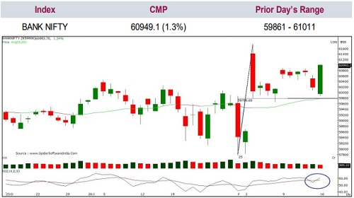 Bank Nifty ended at 60,949, up 762 points. The index formed a bullish engulfing candle on the daily chart, indicating improving sentiment and a constructive near-term outlook.