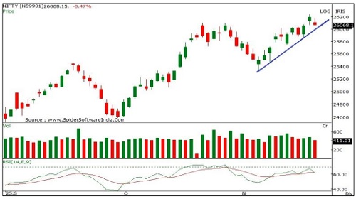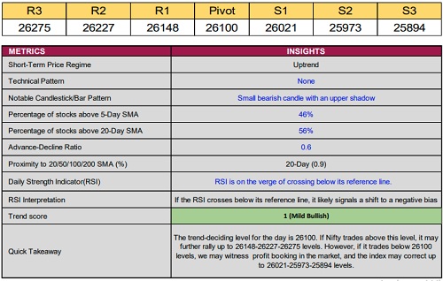 Nifty closed at 26,068 on Friday, slipping 124 points. On the daily chart, the index formed a bearish candle with a long upper shadow, signalling profit booking and strong overhead resistance near the all-time high.