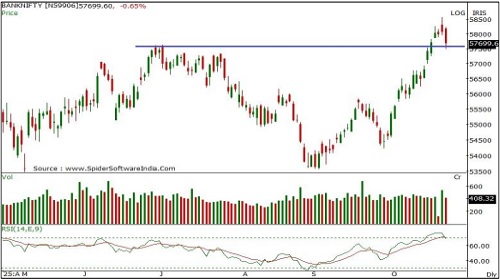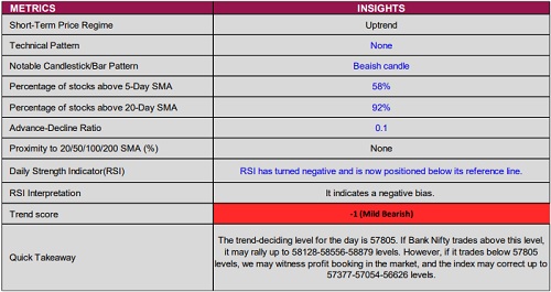 Bank Nifty settled at 57,700, down 378 points. The index closed below the previous session’s low with a bearish candle, indicating a negative bias.