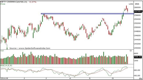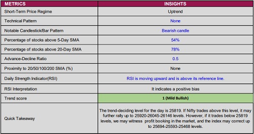 On Friday, Nifty closed at 25,795, with a loss of 96 points. On the daily chart, it formed a sizable bearish candle and closed below the previous session's low, reflecting a negative bias.