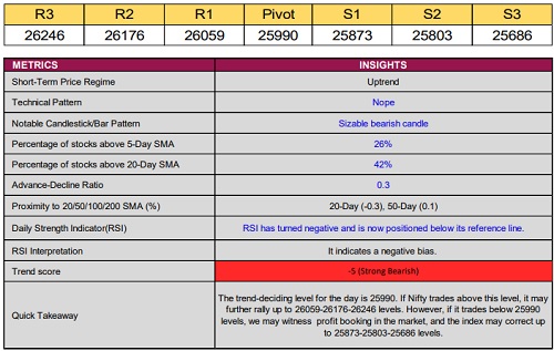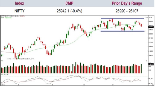 Nifty closed at 25,942 in the previous session, down 100 points. On the daily chart, the index formed a sizable bearish candlestick and closed below the 20-day SMA, indicating a continuation of near-term weakness.