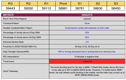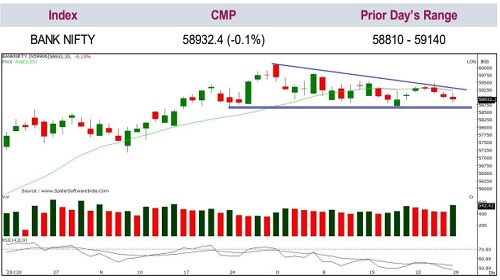 Bank Nifty settled at 58,932, slipping 79 points. The daily chart shows a small bearish candle with shadows on both sides, reflecting short-term indecision among market participants regarding the index’s direction.