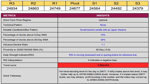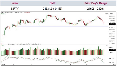 Nifty settled at 24,635, down 20 points, forming a small bearish candle with an upper shadow on the daily chart—signalling selling pressure and resistance at higher levels.