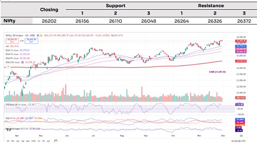 Overnight global action was Positive: On 28st Nov, U.S. markets up with S&P 500 +36.73 pts (+0.54%), Dow Jones up by +289.67 pts (+0.61%) and Nasdaq up by +197.58pts (+0.87%). India VIX was down by ~1.4%. GIFT Nifty is trading down at ~26,522 (-17.50 pts, -0.11%) indicating Indian markets will open positively.