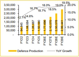 Defence Production to expand ~18% CAGR over FY22-29E (INR Cr)