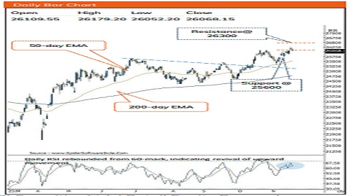 * Going ahead, a decisive close and a follow through strength above All Time high of ~26300 would open the door for revised target of 26800 in the coming month. We believe, sustainability above 26300 would revive market sentiment resulting into broad based participation. Hence, focus should be on accumulating quality stocks backed by strong Q2 earnings, especially from broader market space as Nifty small cap index has approached key support threshold of 200 days EMA. Meanwhile, strong support for the Nifty is placed at 25,600 as it is 61.8% retracement of Sept-Oct rally (24588-26104) coincided with 50 days EMA