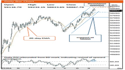 * Key point to highlight is that index continues to trade within its rising channel since September 2025, supported by a recent breakout from a 4-week consolidation range (57,158-58577), indicating sustained upward momentum and a strengthening bullish structure. Going ahead, we believe that only a decisive close below the previous week’s low would signal a pause in the ongoing uptrend, otherwise the upward momentum is expected to continue.