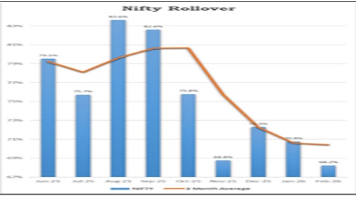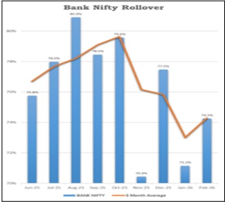 Bank Nifty ended the February series with gains of 3.1% with an increase in open interest by 5.8% indicating long built up. Rollover in Bank Nifty stood at 74.3%, which is in line with its quarterly average of 73%. Now Bank Nifty has to hold above 60500 zones for an up move towards 62000 zones and then 62500 zones while major positional support can be seen at 59500 zones.