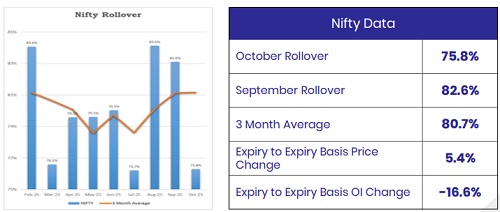 In the October series, open interest fell by 16.6% while the index rose by 5.4% on an expiry-to-expiry basis, suggesting short covering which could lead to fresh longs adding in the November series. Rollover of Nifty stood at 75.8%, which is lower than its quarterly average of 80.7%.