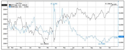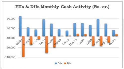 India VIX increased by 8.05% from 11.06 to 11.95 levels in the October series. It briefly crossed 12.7 levels, sparking short-term swings and intraday volatility. Despite these intermittent upticks, the overall subdued volatility range continues to offer comfort to the bulls, suggesting a relatively stable market sentiment ahead.