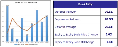 Bank Nifty ended the October series with a gains of 6.6% with a decrease in open interest by 7.6% indicating short covering in the index. Rollover in Bank Nifty stood at 79.6%, which is in line with its quarterly average of 79.6%. Now Bank Nifty has to hold 57500 zones for an up move towards 59000 zones and then 59500 zones while major positional support can be seen at 57000 zones.