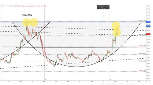 From a technical perspective, Dhaniya displays a very strong structure. Weekly charts confirm a clear rounding-bottom breakout, which earlier indicated a move towards the Rs.11,000 zone—now successfully achieved. On a broader timeframe, the market has carved out a neckline near Rs.12,500, highlighting a powerful bullish setup on both weekly and monthly charts. Momentum indicators remain constructive, reinforcing the medium- to long-term uptrend.