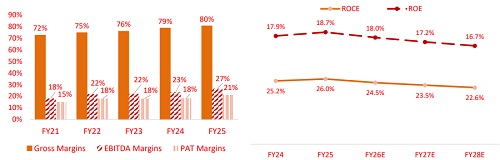 Jenburkt Pharmaceuticals consistently delivers strong profitability, supported by its focus on branded generics, asset-light model, and disciplined cost structure. With high-margin therapies and efficient operations, the company achieved FY25 Gross Margins, EBITDA, and PAT margins of 80%, 27%, and 21% respectively, reflecting superior pricing power and cash conversion. Its net debt-free balance sheet, robust free cash flow generation, and high return ratios (ROE 26%, ROCE 19%) underscore strong capital efficiency. Despite this solid financial profile, the stock trades at attractive valuations relative to peers, offering scope for re-rating as growth catalysts unfold through domestic scale-up and export expansion.