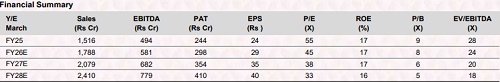 D. Outlook: Rainbow is well-positioned to deliver healthy growth, supported by strong occupancy trends in mature hospitals, improving contributions from new hospitals, and its focused specialisation in paediatrics and maternity care. The company’s hub-and-spoke model provides scalability, while its asset-light expansion strategy ensures efficient capital deployment. Margin expansion is expected as new hospitals mature and operating leverage strengthens. We expect double-digit revenue growth with sustained ~32–33% EBITDA margins over the medium term, backed by disciplined execution and favourable industry tailwinds.