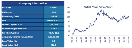* Additionally, PNB holds a 23% stake in Canara HSBC Life and plans to divest around 10% of this holding, expected to generate gains of Rs. 9–10 billion. Liquidity will also benefit from an additional Rs. 150 billion resulting from recent CRR cuts, providing additional flexibility for lending growth and strategic investments. •At the CMP, the scrip is valued at P/BV multiple of 0.9x on FY27E BVPS.