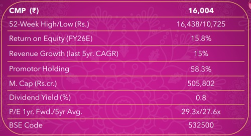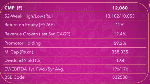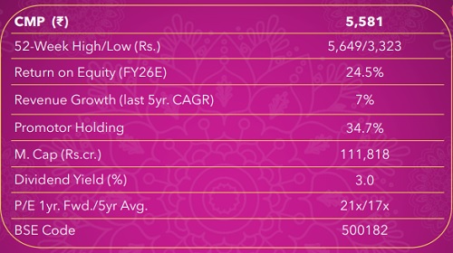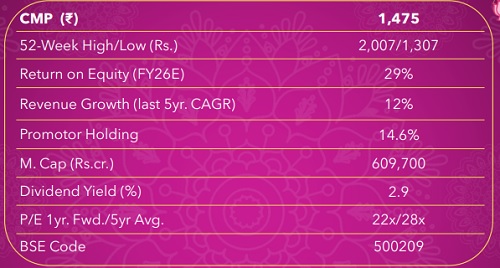 * 1 year fwd. P/E is ~29x (5yr avg is ~28x). Strong earnings growth expectation of ~31% over FY25-27E justifies improvement in future valuation.