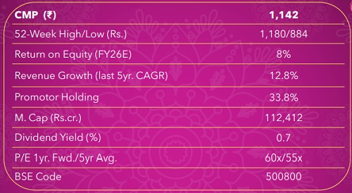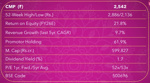 * We expect the revival in demand, especially from rural areas, will aid healthy earnings growth over the next year. At a 1-year fwd. P/E of ~52x, the stock is trading below its long-term average and also its peers.