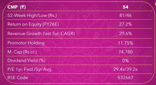 * At a 1year fwd. P/E of ~60x, the stock is trading moderately above its long-term average, factoring in strong earnings growth of ~27% CAGR over FY25-27E.