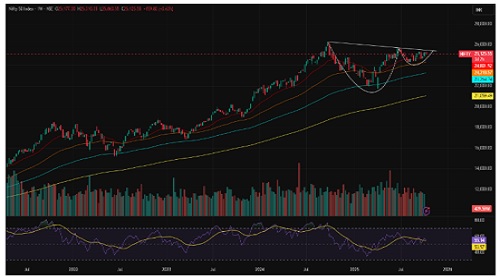 The Cup and Handle formation observed on the weekly timeframe further strengthens the bullish setup. The lower band of this sideways range aligns closely with the short-term 20-day EMA, providing additional technical support in the 24,000–23,800 zone. A rebound from these levels could mark the beginning of a renewed upward move.