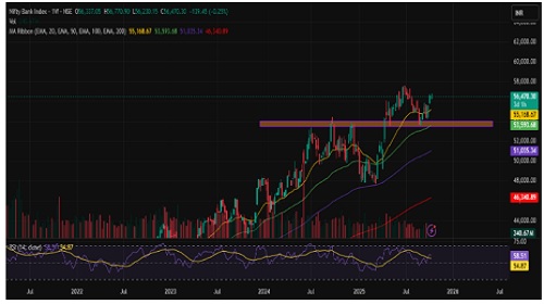 The index is expected to find strong support between 54,000–53,500, offering a favorable buying opportunity for long-term investors. Any correction toward this zone should be viewed as a healthy pullback, allowing the index to build momentum for the next leg of the rally. As long as Bank Nifty holds above this key support, the bullish outlook remains intact.