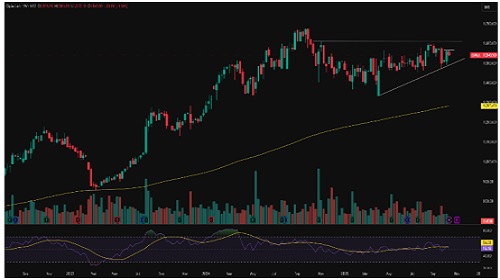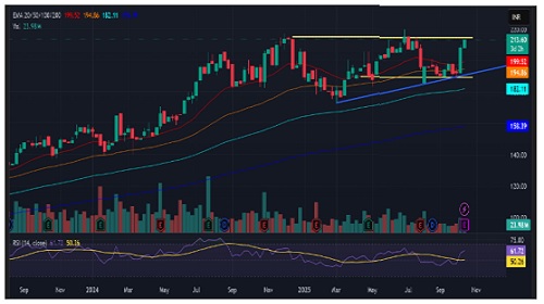 * Currently trading around 213, the stock has been consolidating within a broad range of 195–215, with each correction finding firm support along the rising trendline. The 20-day and 50-day EMA are acting as near-term support zones, while the medium-term structure remains intact reinforcing the underlying strength.