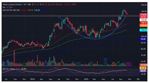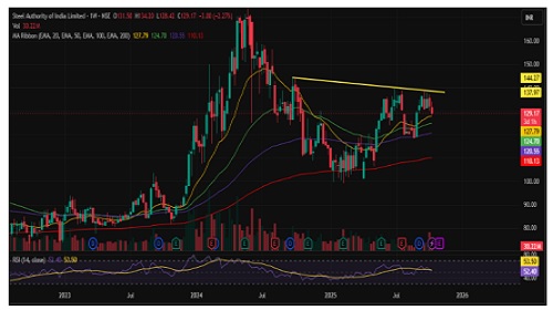 * SAIL is exhibiting a strong bullish setup on the weekly chart, forming a classic Cup and Handle pattern, a well-known bullish continuation formation that typically signals accumulation and trend resumption. Following a steady recovery from lower levels, the stock has built a solid technical base and now appears poised for a decisive breakout. A sustained close above the Rs.138 level, supported by rising volumes, could act as a strong trigger for the next leg of the rally
