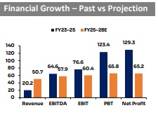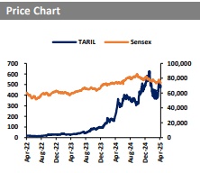 However, we believe TARIL’s $1 bn revenue goal and 40% gross margin target by FY28 is aggressive and could be delayed due to global economic uncertainty stemming from ongoing tariff wars, which may weigh on India’s economic and manufacturing growth. Accordingly, we factor in the revenue milestone of INR 8,600 cr by FY29 (deferred by 1 year) and the 40% gross margin target by FY31 (deferred by 3 years). Over FY25–28E, we forecast revenue, EBITDA & net profit to grow at a CAGR of 50.7%, 57.9% & 65.2%, respectively, reaching INR 6,900 cr, INR 1,290 cr & INR 967 cr. EBITDA & net margins are projected to improve 246 bps & 339 bps to 18.7% & 14%, respectively, by FY28E.