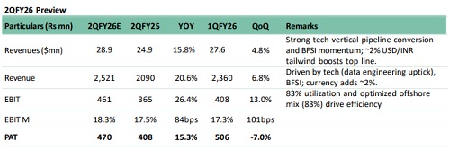 LatentView's 2QFY26 is expected to deliver revenues growth of ~21% YOY driven by tech and BFSI verticals, and a ~2% currency tailwind. EBIT margin is expected to expand by 84bps YoY, fueled by 83% utilization and an optimized offshore mix. PAT expected to grow ~15% YOY but dip 7% QoQ due to a lower ETR is 1QFY26. Expect commentary on lingering macro risks, European and South American expansion.