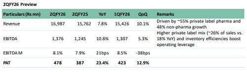 MedPlus' Q2FY26 revenue is expected to grow ~8% YoY driven by ~55% private label pharma and 48% non-pharma growth, and Tier-2/3 expansion. EBITDA expected to rise by ~11% YoY due to higher private label mix (~22% vs. 18% YoY) and inventory efficiencies. Expect comments on SSSG recovery, opportunity size in GLP drugs, store growth guidance.
