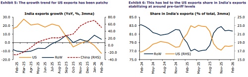 US exports pick up after interim deal; expected to improve going ahead Exports to the US rose 4% MoM (USD6.9bn) and are likely to have been aided by the interim India-US trade deal announcement in early-Feb. RoW exports declined 1% MoM (USD30bn). Exports to the US were up ~4% to USD79bn for FY26TD; however, an unfavorable base is likely to pull down growth for FY26. RoW exports were up ~1% for FY26TD (USD324bn), having risen 4% YoY from Sep-25 to Feb-26. This was led by sharp growth in exports to Spain (68% YoY), China (53%), Hong Kong (34%), Vietnam (30%), and the UAE (10%) post-tariff imposition. While this diversification is welcome, the lower US headline tariffs of 10% going ahead are likely to shift exports back to the US (albeit the Iran crisis puts this at risk).
