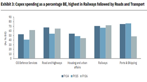 Capex spending strong: The pace of overall government expenditure was healthy in 8M FY26, rising by 6.75% YoY versus 3.35% YoY growth in 8M FY25, led primarily by higher capex spending. Capital expenditure continue d its healthy momentum, surging 28.1% YoY in 8M FY26 versus a 12.3% decline in 8M FY25, with ~ 58.7% of BE achieved versus 46.2% in 8M FY25. Q3TD, capex have seen a YoY decline of 21.4%, and we expect this trend to pick pace in rest of FY26. Among key ministries, the Ministry of Road Transport & Highways and the Ministry of Railways have already spent 65% and 72.2% of their annual capex allocation in 8M FY2 6, respectively. Notably, capital outlay under defense services re corded 61.9 % of FY26BE, the highest run rate for the segment on record. Overall, owing to soft spending on other heads, we see a shortfall of INR 300bn on capex spending.