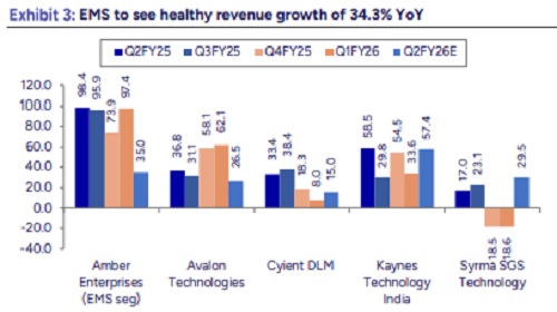 Electronics manufacturing services (EMS) companies under our coverage are expected to post strong YoY revenue growth in Q2FY26, due to decline in AMBER revenue. KAYNES, SYRMA and AVAL are likely to continue their strong momentum, with YoY revenue growth of 57%, 30% and 27%, respectively. Profitability is set to improve sharply, with margin expansion across the board driven by increasing exposure to high-margin segments. We estimate ~60bps YoY expansion in EBITDA margin and ~30% YoY growth in PAT for our EMS coverage universe in Q2FY26. Looking ahead, we expect pickup in order book across EMS companies, supported by their strategic focus on high-margin sectors and orders, which should further support margin expansion in the coming quarters